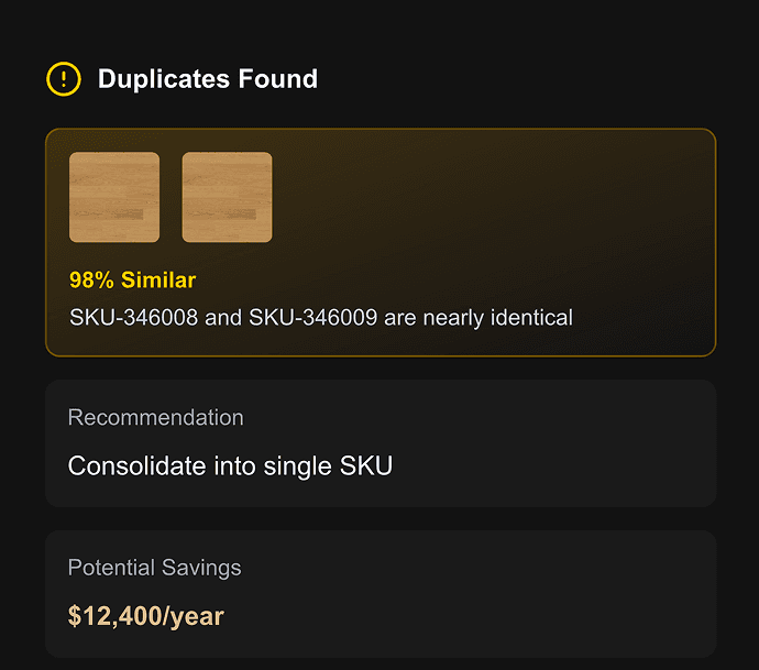 Delegate AI to analyze visual similarity, material attributes, and historical usage to surface redundant SKUs, recommend consolidation candidates, and standardize product offerings.